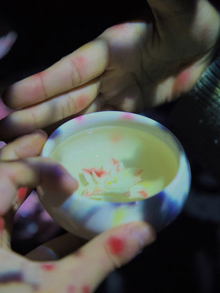 Participants were served in three phases—tea, dinner, dessert—each accompanied by corresponding visual changes. As they reached for dishes or interacted with the space, the projections bloomed outward, responding like petals to light. The design blurs boundaries between private ritual and shared spectacle, between stillness and motion.